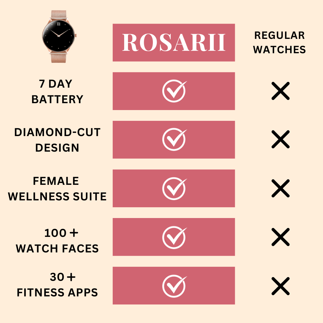 The Rosarii smart watch monitors heart rate, blood pressure, sleep, blood oxygen levels, and cycle tracking.